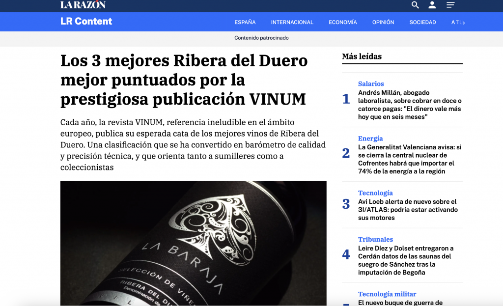 Nos alegra mucho compartir con vosotros este artículo que recoge las prestigiosas puntuaciones de la revista VINUM, en las que La Baraja de Vilano es el tercer mejor vino después de Pago de Capellanes y Tábula.